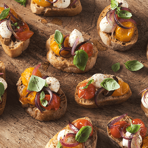 Bocconcini are small mozzarella balls and like mozzarella they are a semi-soft rindless, mild cheese that originated in Naples. Once made only from the milk of water buffalo they are now made using cows milk. This deliciously creamy cheese is perfect served with ripe, sweet roasted cherry tomatoes. Place the roasted tomatoes and bocconcini on the toasted ciabatta bread and sprinkle with fresh basil for the perfect appetiser.